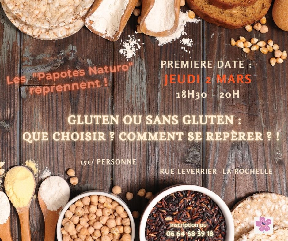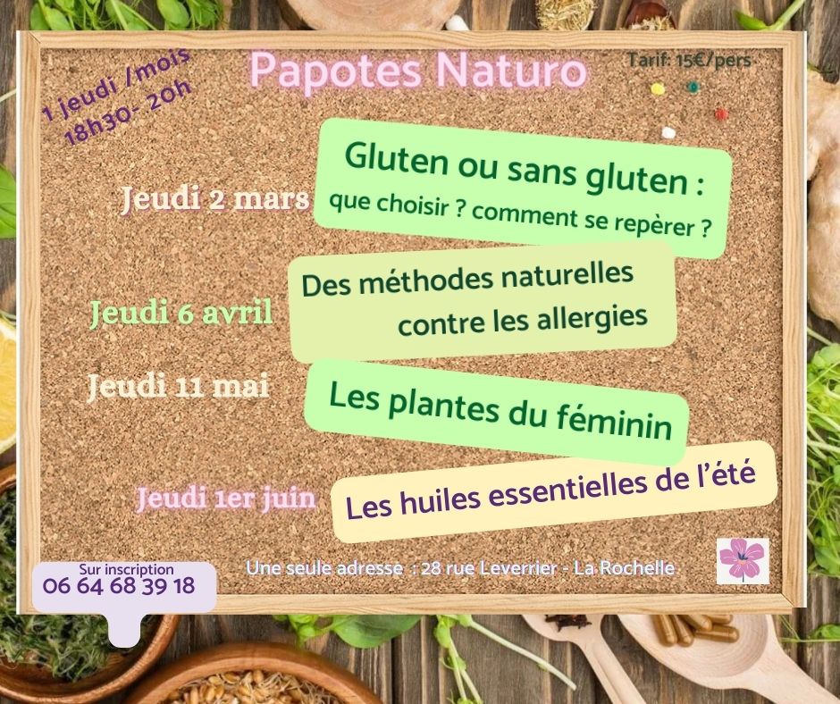 Des "Papotes Naturo" d'1h30 sont proposés en fin d'après-midi, un jeudi par mois sur La Rochelle. Il s'agit d'échanges conviviaux de 5 personnes maximum, autour d'un sujet précis : que penser du gluten? fleurs de Bach, sommeil, plantes du féminin....